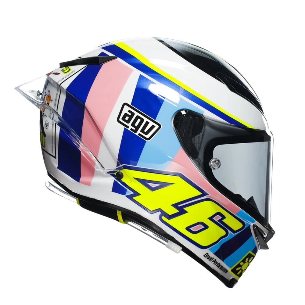 A helmet’s job first and foremost is to provide protection. Constructed from Carbon, this Multicolor Pista GP RR offers the advantage of a very lightweight construction and superior distribution of energy upon impact. Plus it looks cool! The chinstrap is an important part of the helmet’s effectiveness in a crash and It is also the part that you interact with the most when putting on and taking off the helmet. The Pista GP RR features a Double-D buckle. This is probably the oldest style buckle and has the simplest design. Yet it is considered to be the safest to date and Double-D chin straps are the only ones allowed on the racetrack. Of course all of our helmets are certified and road legal for European roads as this helmet is DOT, ECE 22.06, FIM approved. This safety rating is also road legal in many other countries like Australia and Canada.